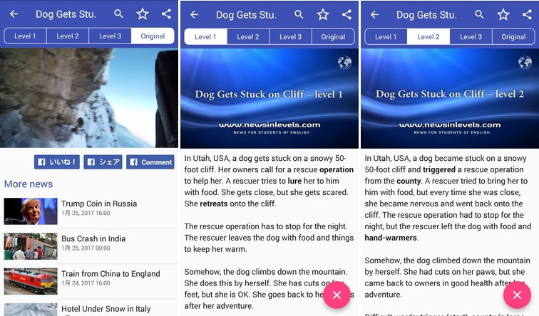 英語ニュースが3つのレベルでリライトされていて、それぞれのニュース毎にレベルを選べる。