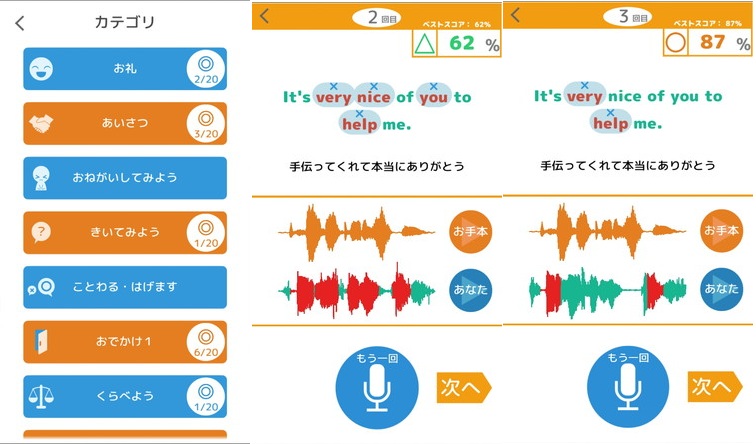 英語アプリ 英語発音ドリルAtoZ 発音の判定をしてくれるアプリ。お手本となる英語フレーズを聞いて、自分でも発声する。すると自動で判定してくれる。シンプルな練習だが、スコアを上げたくなって、何度も発声したくなる。 2017.02.19 英語アプリ